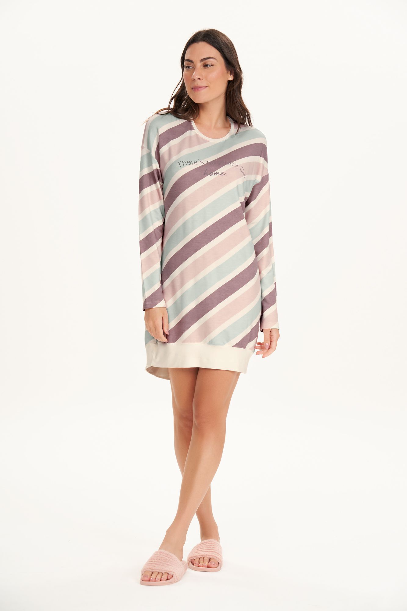 CAMISOLA MANGA LONGA EM MOLECOTTON DE VISCOSE (FRIBA NATURAL) SUPER CONFORTÁVEL, MODELAGEM COM CAVA DESLOCADA, DETALHE DE TAPA COSTURA COM CADARÇO CONTRASTANTE EM LUREX COBRE, ESTAMPA LOCALIZADA COM EFEITO DE PUFFING (ALTO RELEVO). UMA CAMISOLA PARA CURTIR MUITO SEUS MOMENTOS EM CASA.