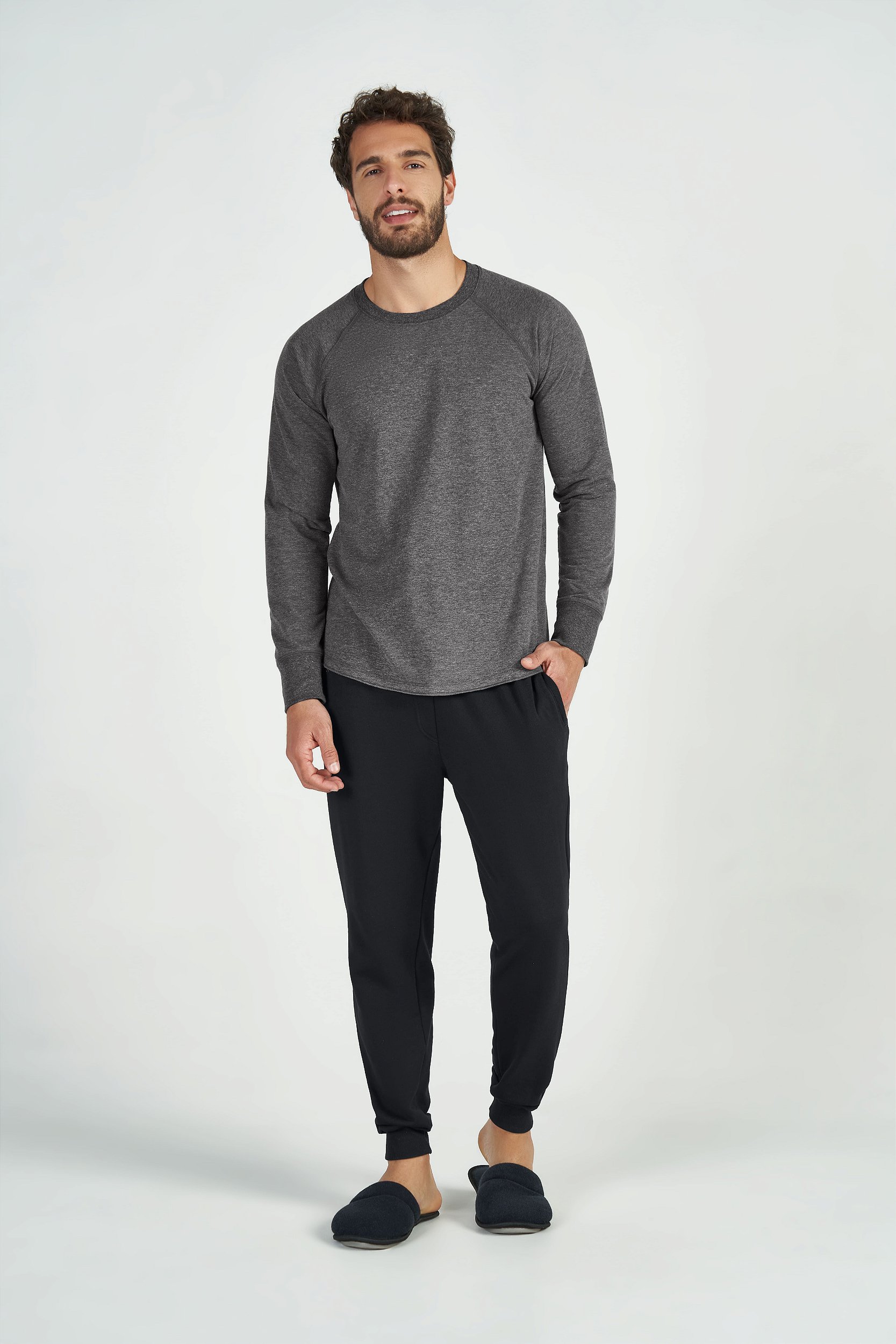 Blusa masculina manga longa em moletinho sem felpa, modelagem com mangas raglã super versátil e confortável, detalhe de trançador nos punhos e barra mais arredondada, disponível em duas variantes de cor: preto e mescla médio. Perfeita para todos os momentos! Modelo Veste M.