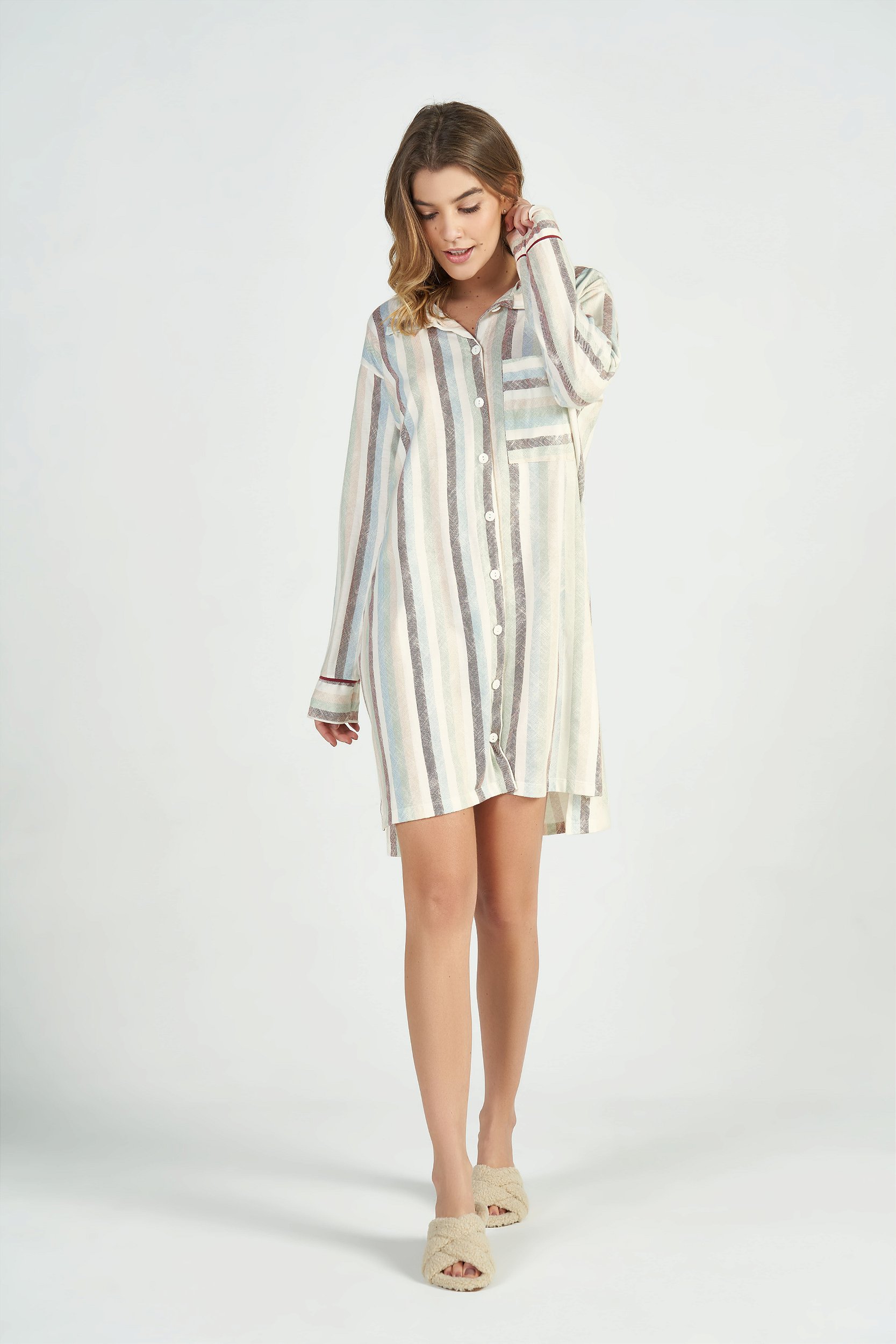Camisola manga longa em meia malha peletizada 100% algodão, com estampa rotativa de listras texturizadas. Modelagem levemente mais ampla com cavas deslocadas, frente com abertura funcional ideal para gestantes e pós cirúrgico, bolso lateral com formato um pouco maior que o tradicional, detalhe de abertura na lateral da peça. Leve e confortável para você aproveitar seus melhores momentos! Modelo veste P.