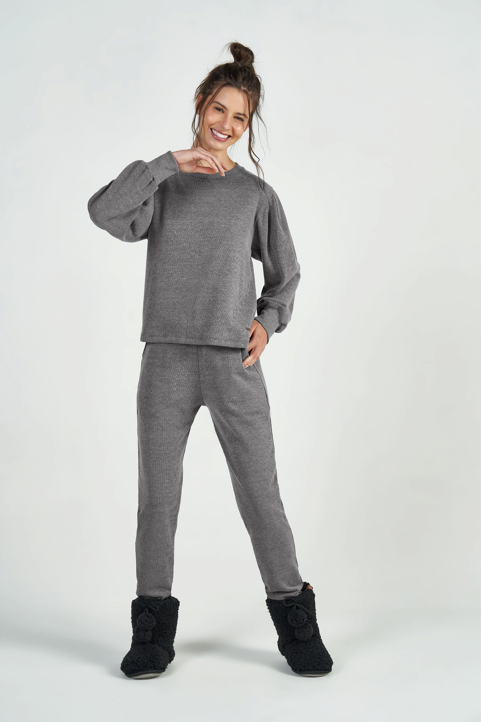 Pensando numa peça super versátil para você usar dia a dia esse é o conjunto em manga longa em malha canelada com efeito estonado. A modelagem das mangas com pregas embutidas para dar volume, deixando o visual mais moderno. Acabamento nas mangas com punho molde em ribana, detalhe de plaquinha de metal personalida na lateral esquerda de quem veste. Calça com modelagem afunilada e bolsos embutidos nas laterais. Vale a aposta!