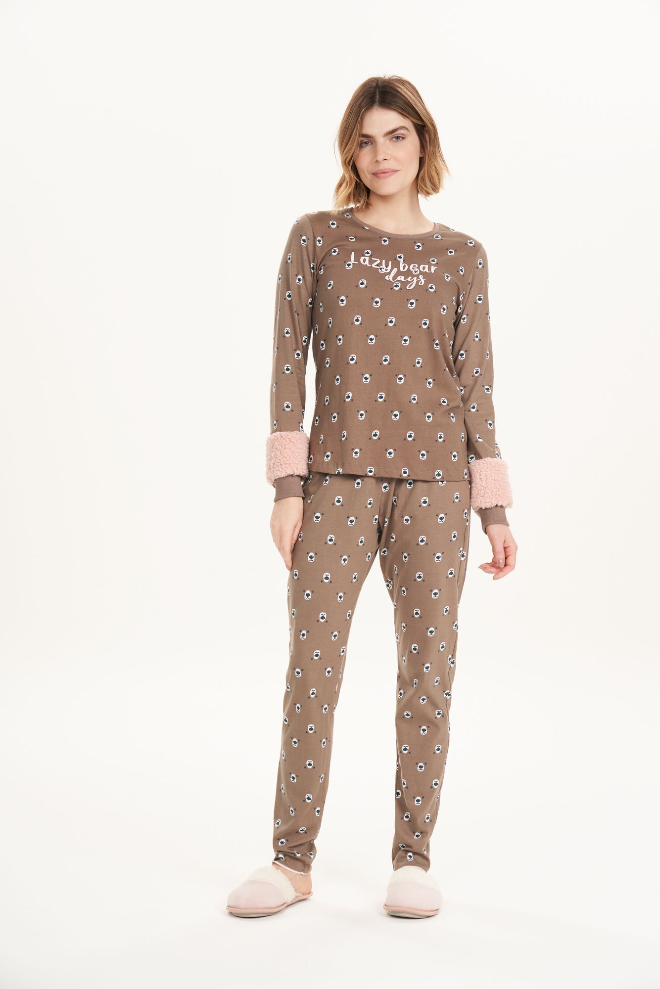 Pijama manga longa em meia malha 100% algodão (fibra natural) mangas com recorte em pelo na cor rosa e estampa rotativa com rostinho de ursos super fofa e divertida, blusa com punhos em ribana e calça com modelagem mais ajustada e falso amarrador em cadarço de algodão aplicado no centro do cós, acabamento da boca da perna com filete contrastante, e para ficar ainda melhor tem pijama infantil para usar combinando! Modelo veste 8.