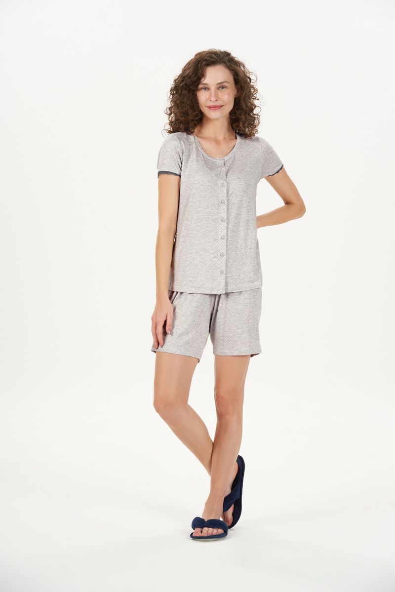 Bermudoll manga curta em viscolycra com estampa total de micro poá agulha na cor chumbo!! Uma opção para uma gestante ou pós cirurgico. Mangas com acabamento de renda contrastante. Bermuda com cintura de elástico 2 cm. Modelagem da bermuda um pouco mais comprida.