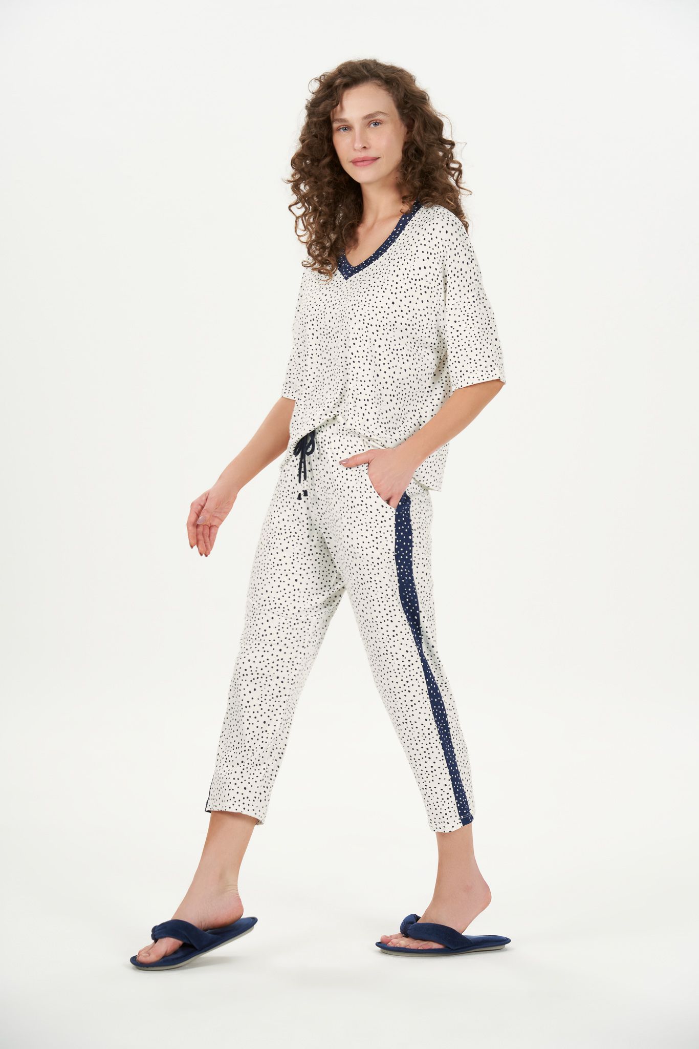 Essa coleção tem uma proposta leve, calma e traz essa sensação de descanso! Esse pijama todo em viscolycra com elastano te faz sentir leve, a malha tem frescor e é super confortável com um toque maravilhoso, a proposta traz uma composição de poás com fundo escuro e claro, dando um ar elegante e atemporal, a blusa tem uma modelagem um pouco mais ampla para não marcar no corpo, com as mangas deslocadas e o decote em V com poá no fundo escuro, a calça tem um fit no estilo pantacurt dando a peça um ar moderno e elegante, possui um detalhe de faixa lateral no poá com fundo escuro e para deixar esse ar moderno ainda mais evidente acrescentamos um falso amarrador em cadarço marinho com detalhe em linha nas pontas aplicado no centro do cós, você vai estar bem vestida e confortável em todos os seus momentos de descanso!