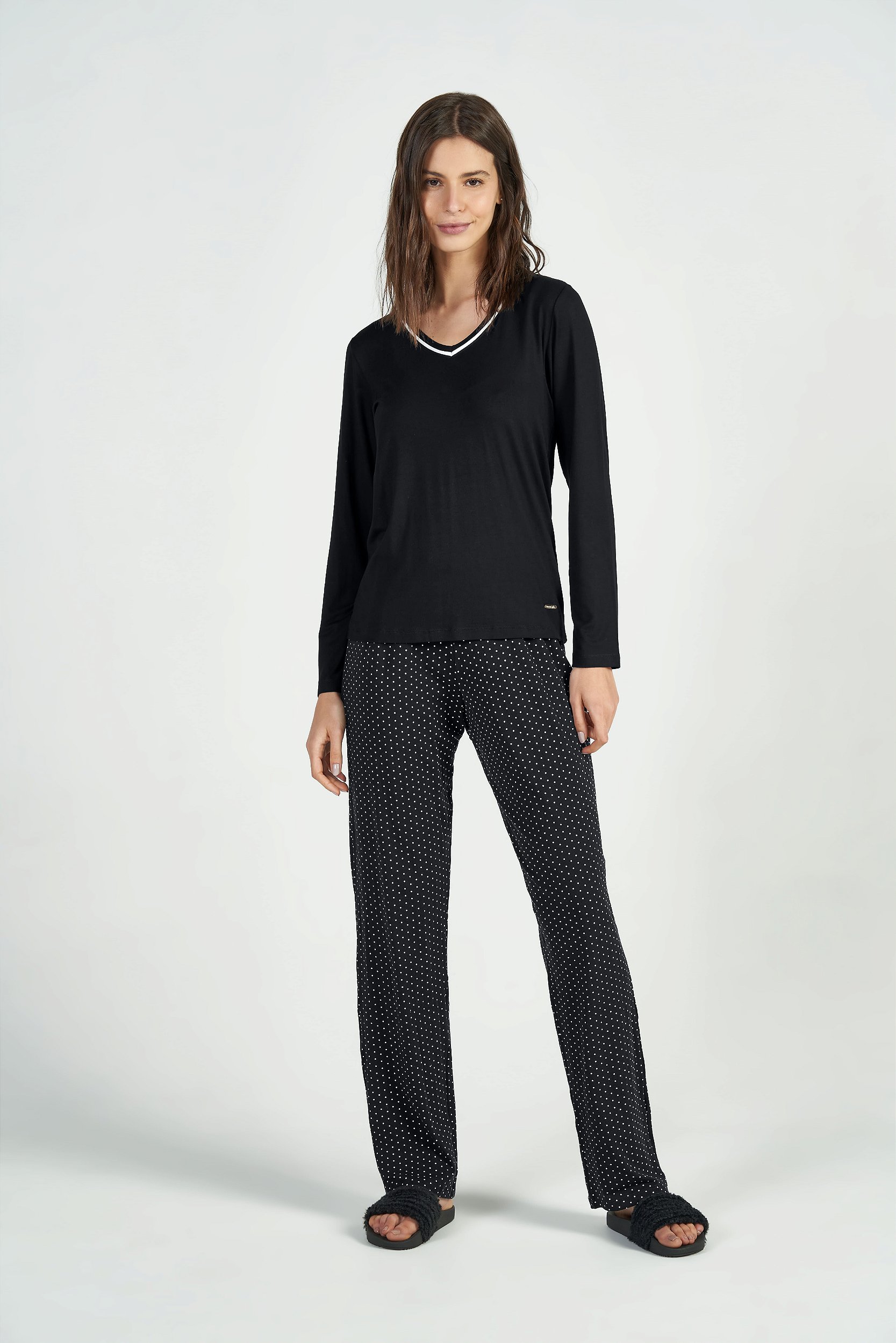 Pijama manga longa confeccionado em viscolycra, com decote V e viés contrastante. Calça reta com estampa de maxxi poá super moderno e atemporal. Vale apostar!!