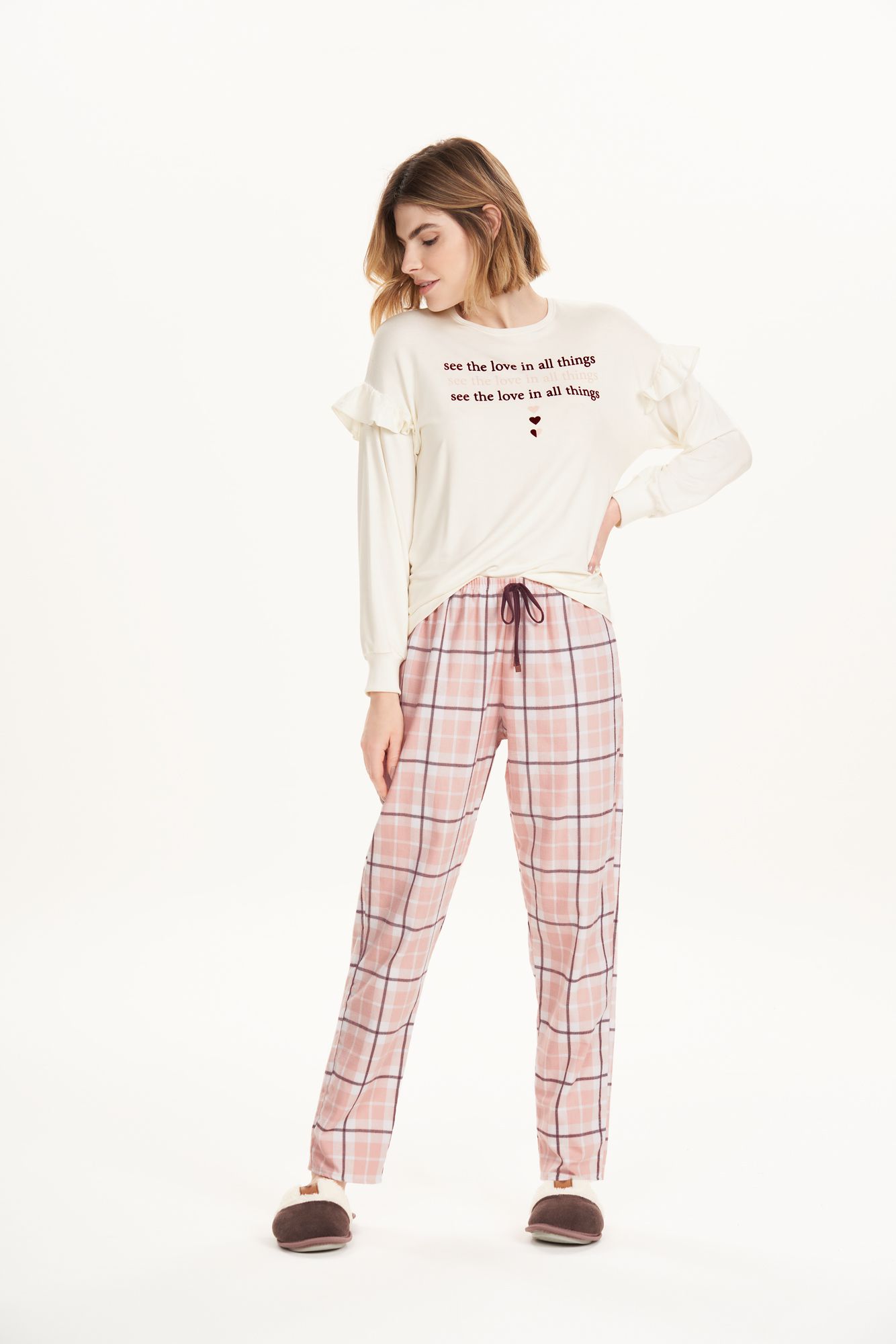 Características:Pijama feminino.Modelagem super moderna.Blusa manga longa em molecotton de viscose.Detalhe em babados na manga.Possui punho na manga.Estampa na parte da frente.Calça em flanela de algodão.Modelagem mais afunilada na perna.Possui cós elástico e amarrador com pingente personalizado.Estampa em xadrez.Composição:Blusa: 97% Viscose, 03% Elastano.Calça: 100% Algodão.