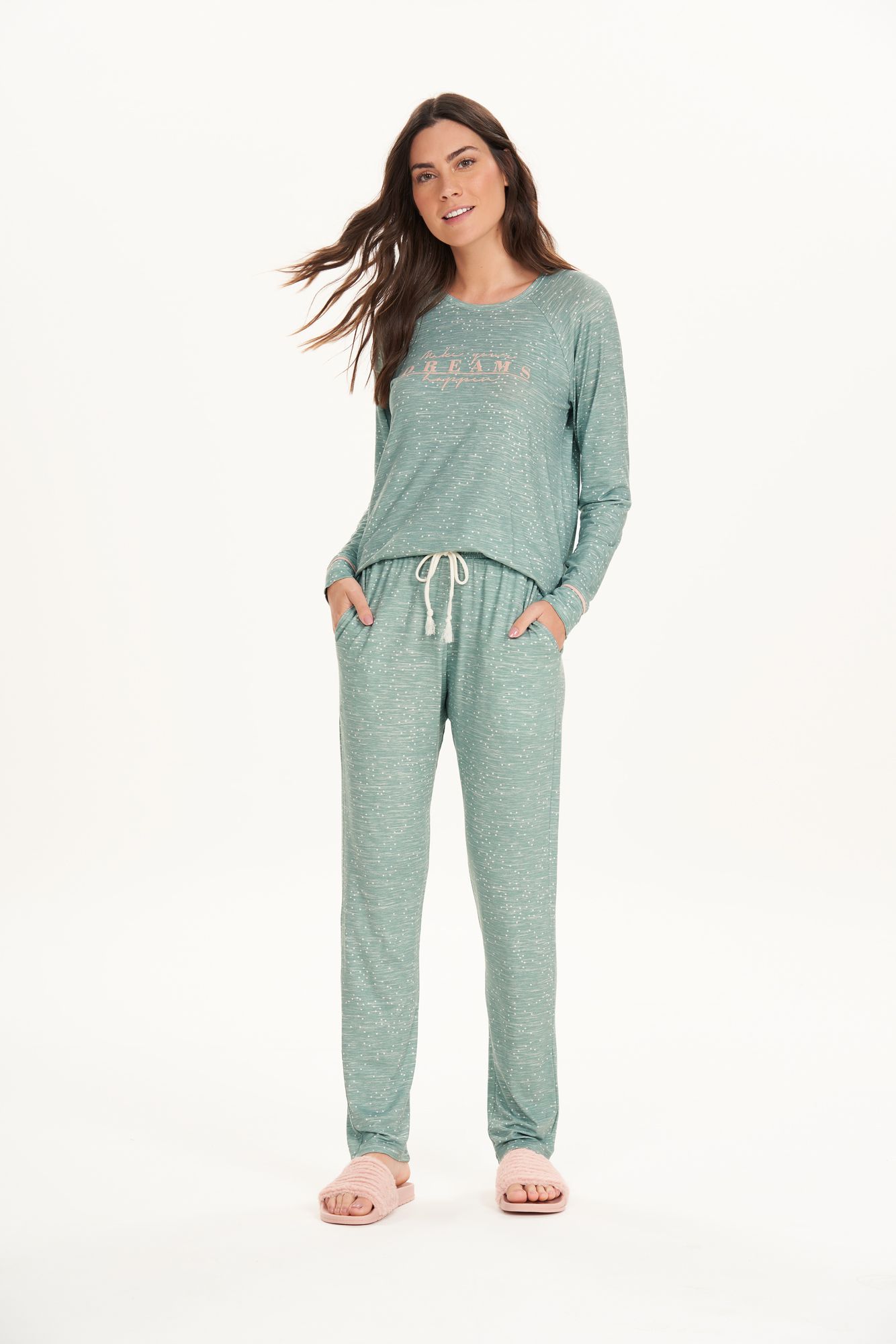 Conjunto manga longa em Viscose estampa Poá Danka. Blusa manga longa poá gola careca e estampa escrita na parte frontal, mangas soltinhas. Calça em Viscose cós com Elástico para melhor ajuste e amarrador falso.