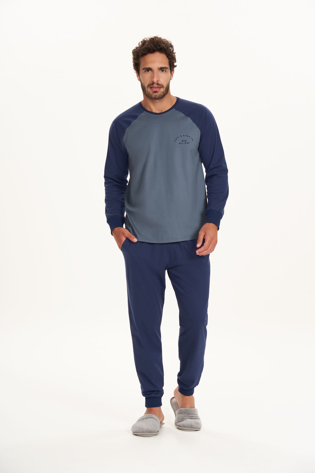 CONJUNTO EM MEIA MALHA 100% ALGODÃO, BLUSA COM MANGA RAGLÃ CONTRASTANTE COM PUNHO EM RIBANA CANELADA AJUSTADA PARA MAIOR CONFORTO NA HORA DE DORMIR. ESTAMPA LOCALIZADA NA LETRAL ESQUERDA DE QUEM VESTE. CALÇA COM CINTURA EM ELÁSTICO 4 CM COM AMARRADOR EM CADARÇO DE ALGODÃO FUNCIONAL, BOLSO MOLDE EMBUTIDO E MODELAGEM JOGGER