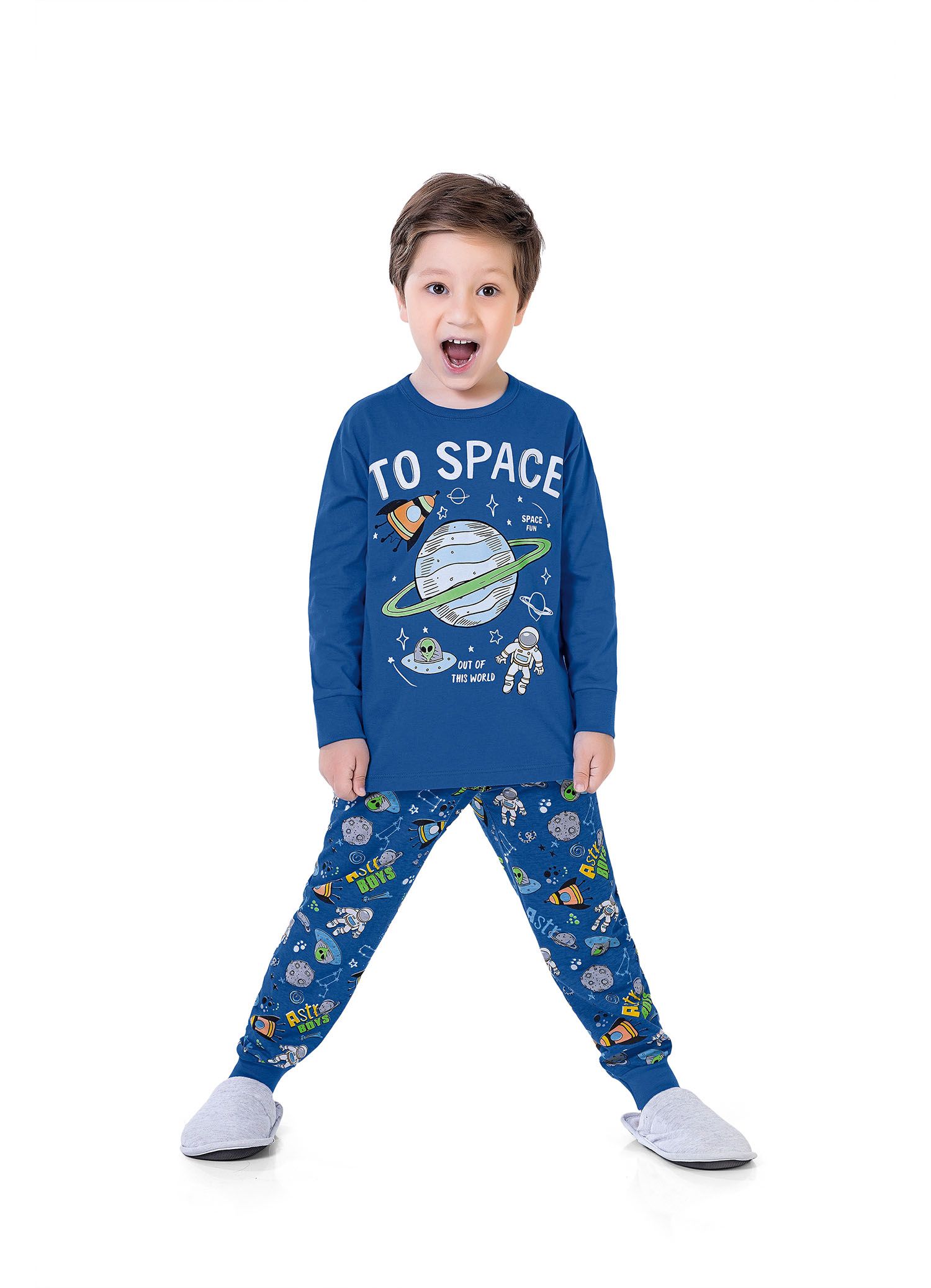 DESCRIÇÃO: Conjunto Pijama Camiseta Manga Longa e Calça confeccionado em meia malha, possui modelagem slim, decote redondo, manga reta longa, estampa do sistema solar localizada e estampa rotativa com detalhes que brilham no escuro, elástico na cintura e punho na barra da calça, comprimento longo.