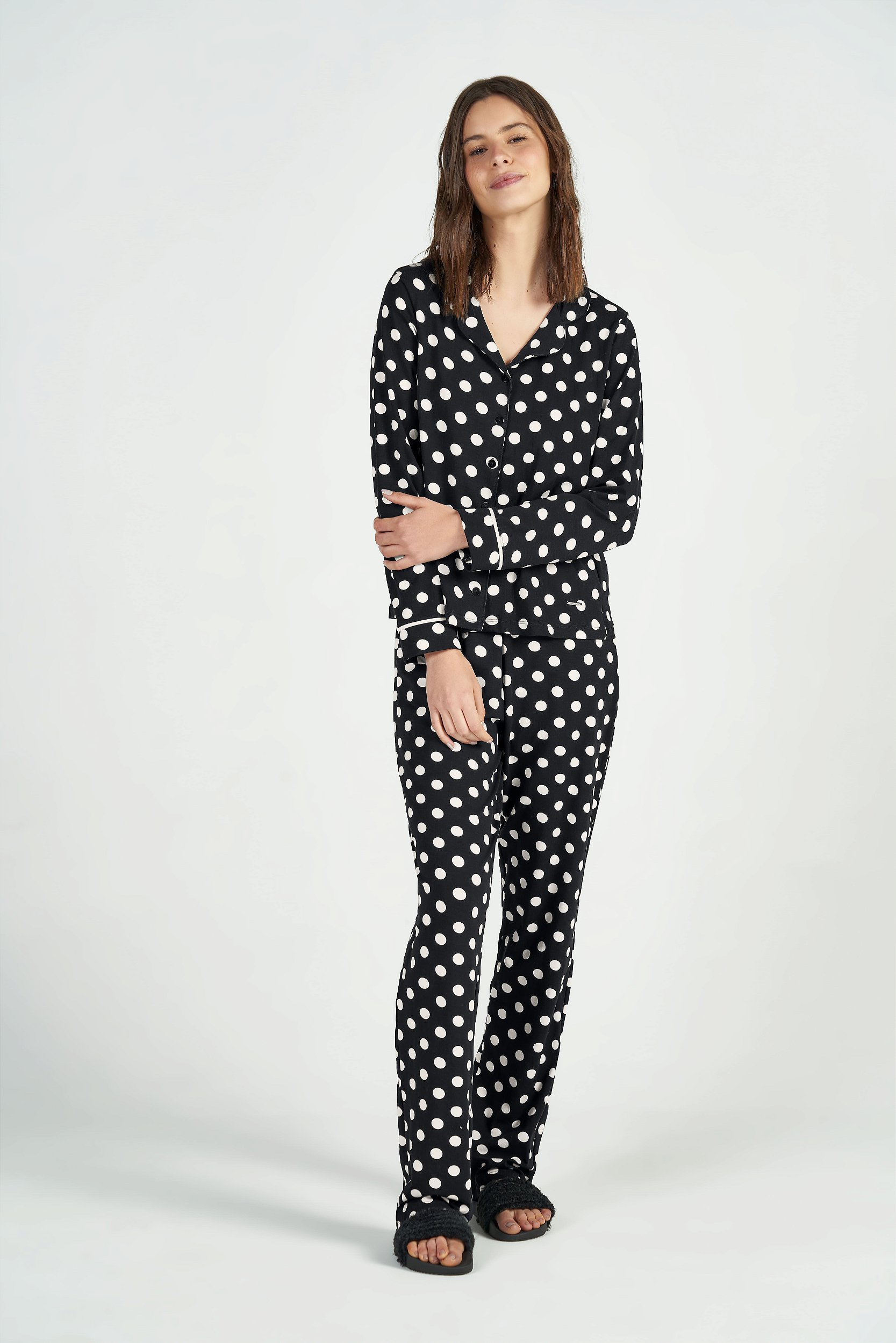Para quem gosta de uma look estilo americano, vale apostar nesse conjunto confeccionado em viscolcyra. Super macio e confortável. Estampa de maxxi poá super moderna e atemporal, trabalhamos com recorte no punho e viés de malha contrastante.Uma ótima aposta para amamentação ou pós-cirurgico.