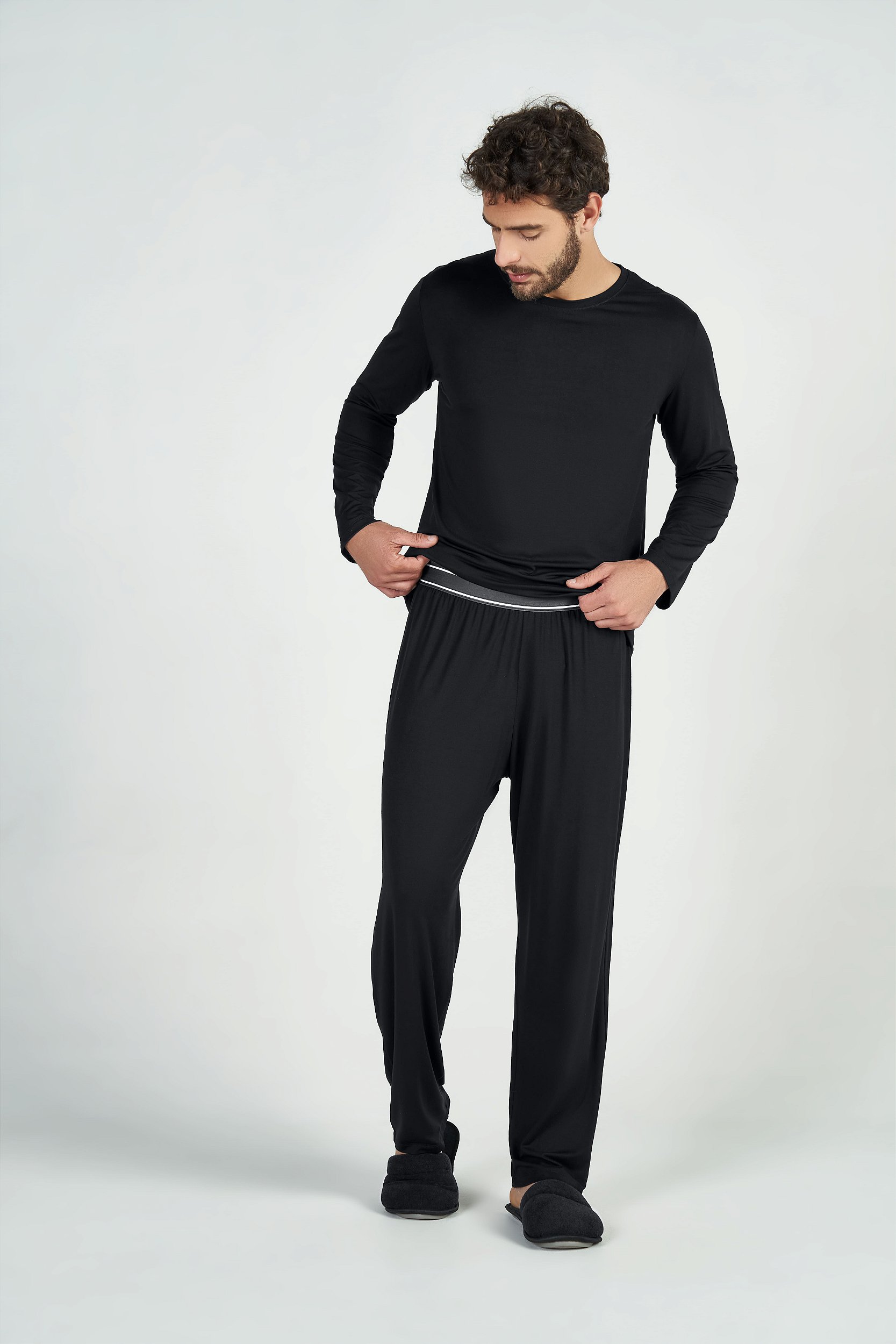 Pijama manga longa todo em viscolycra preta, malha com excelente caimento e toque. Blusa com modelagem no estilo T-shirt com detalhe em etiqueta de courinho aplicada na lateral, calça com fit reto e elástico na cintura. Uma ótima opção para aproveitar seus momentos de descanso.