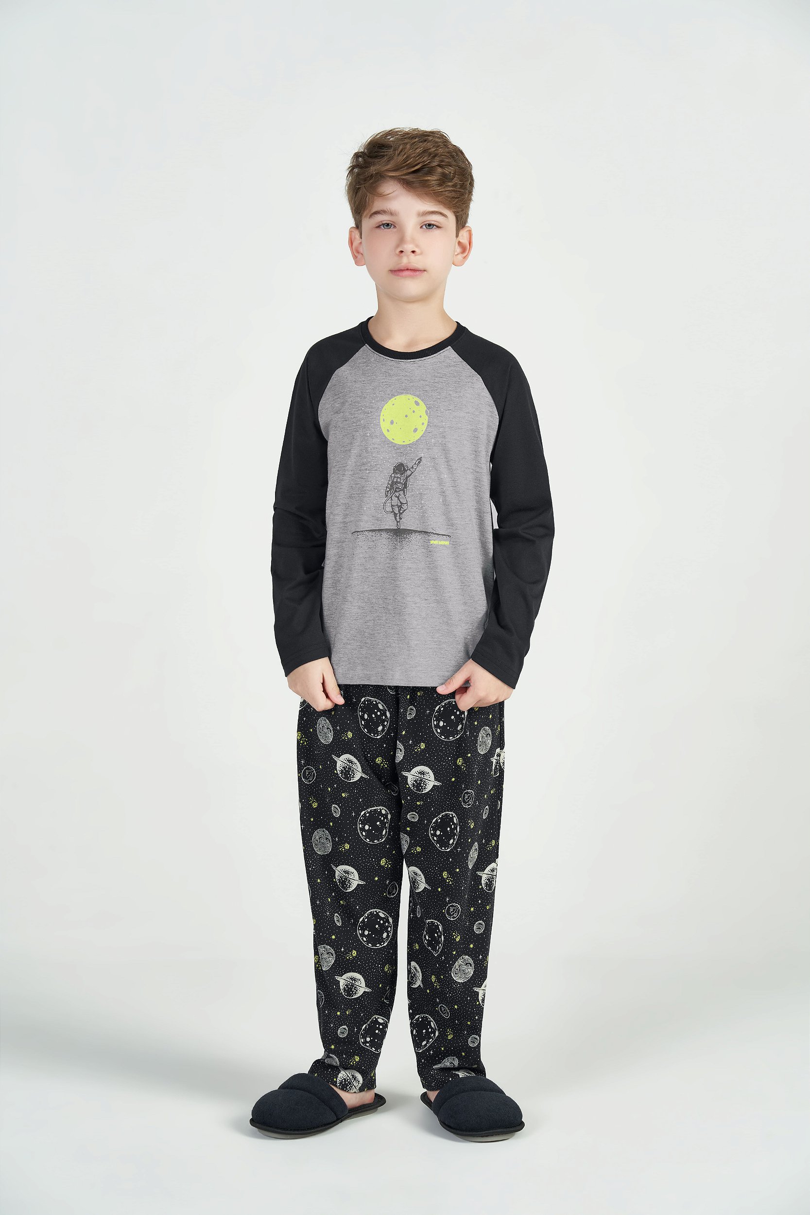 Pijama manga longa em meia malha, blusa com fit raglã e mangas contrastantes, frente e costas em meia malha mescla normal com estampa localizada que brilha no escuro. Calça reta com estampa rotativa de planetas, um universo de conforto e diversão!