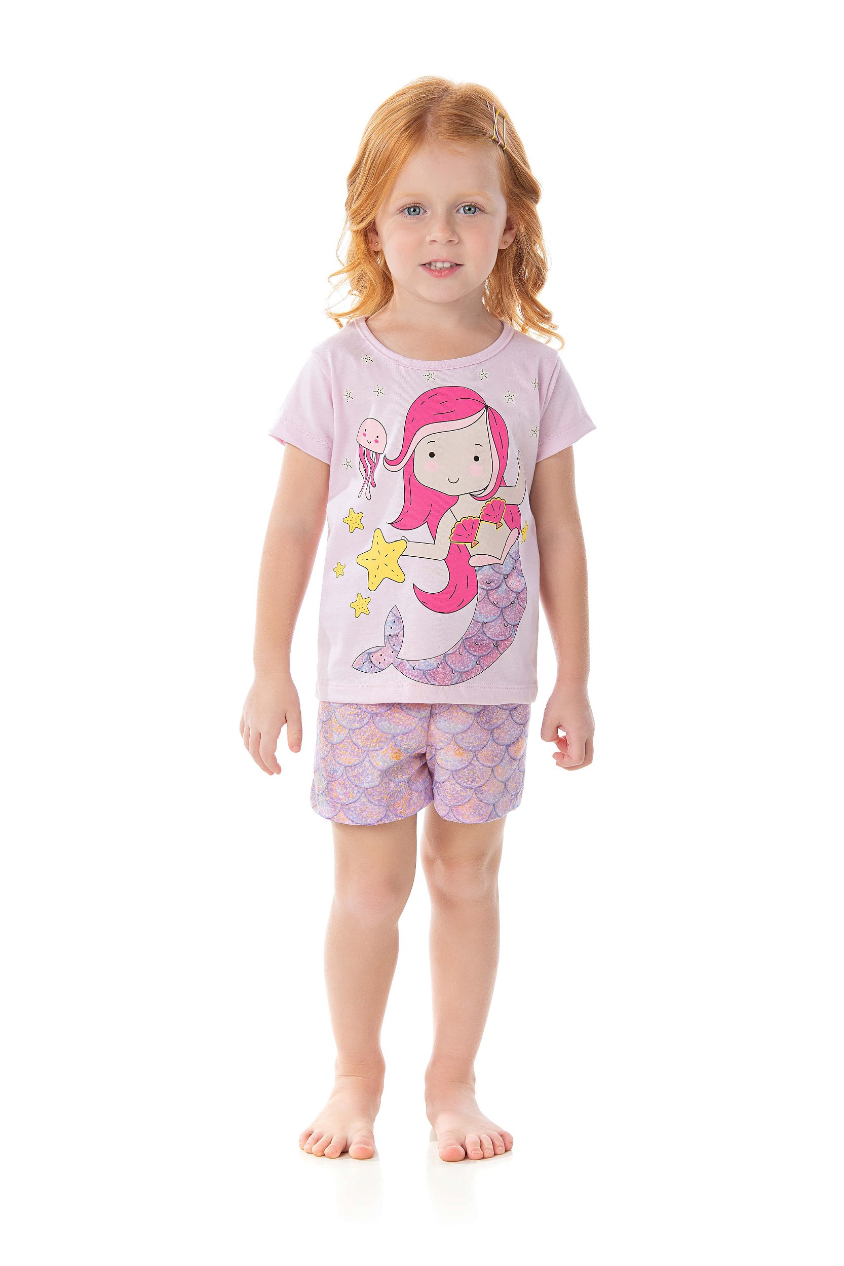 Lindo Pijama para meninas . Modelo blusa com estampa gola redonda. Tecido leve de algodão que facilita a transpiração e mantém sua bagunceira confortável durante o sono. Acompanha Shorts com estampa e elástico na cintura. Estampa de sereia com detalhes que brilham no escuro deixam a hora de dormir ainda mais divertida.