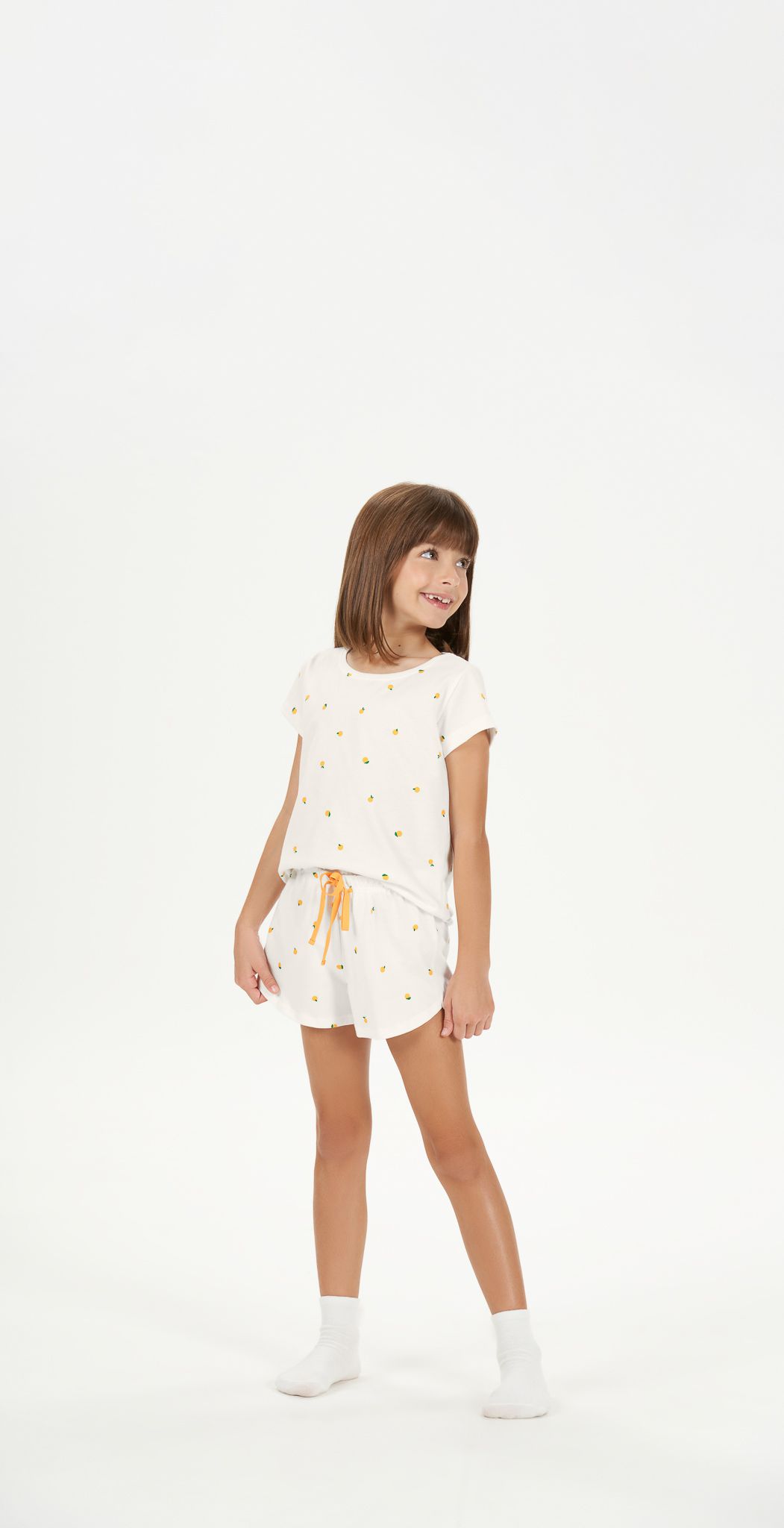É dia de feira..E que tal fazer uma salada de frutas bem refrescante??? Trazemos uma proposta super divertida em um short doll manga curta de meia malha com estampas de frutinhas. Você pode optar entre maçã, pera e laranjas..Ou melhor ainda.. Todas!!! Todas as variantes tem uma brincadeirinha de estampa no silk nuca: Variante 1 - the apple of my eyes Variante 2 - you are pear-fect Variante 3 - you are orange sweet Short com cintura de elástico 2 cm e falso amarrador em fita de poliamida contrastante, modelagem do short com laterais mais levantadas.