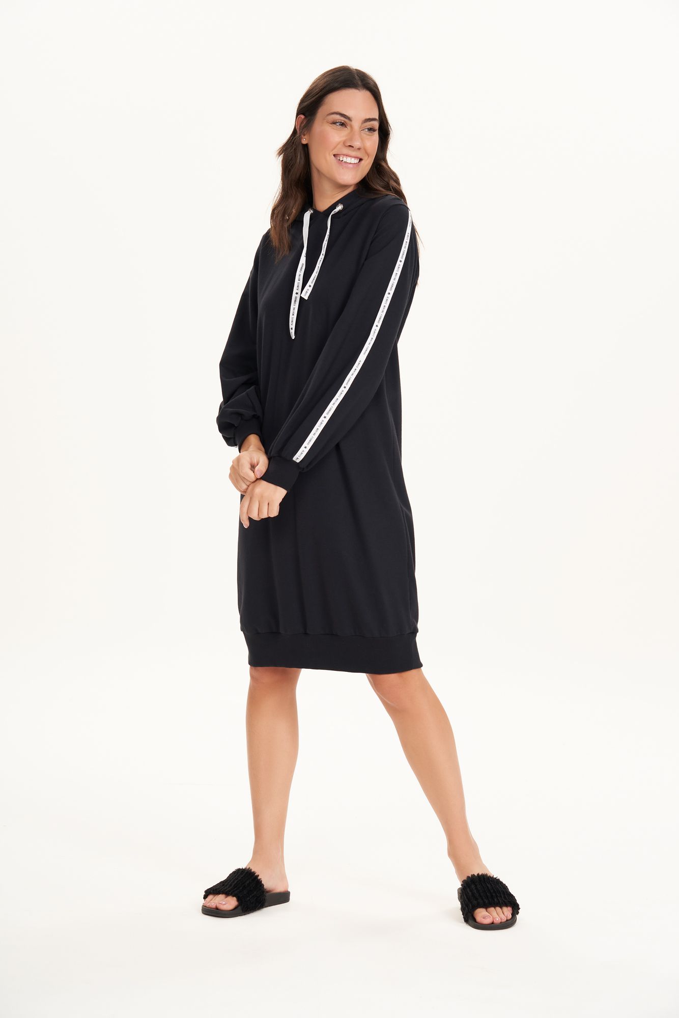 Características: Camisola feminina adulto. Modelo manga longa com capuz. Cadarço personalizado aplicado nas mangas e no capuz. Manga com modelagem mais lanterna. Detalhe fofinho na parte inferior. Levemente mais ampla. Detalhe na parte interna do capuz em pelo preto. Punhos e barra em ribana.